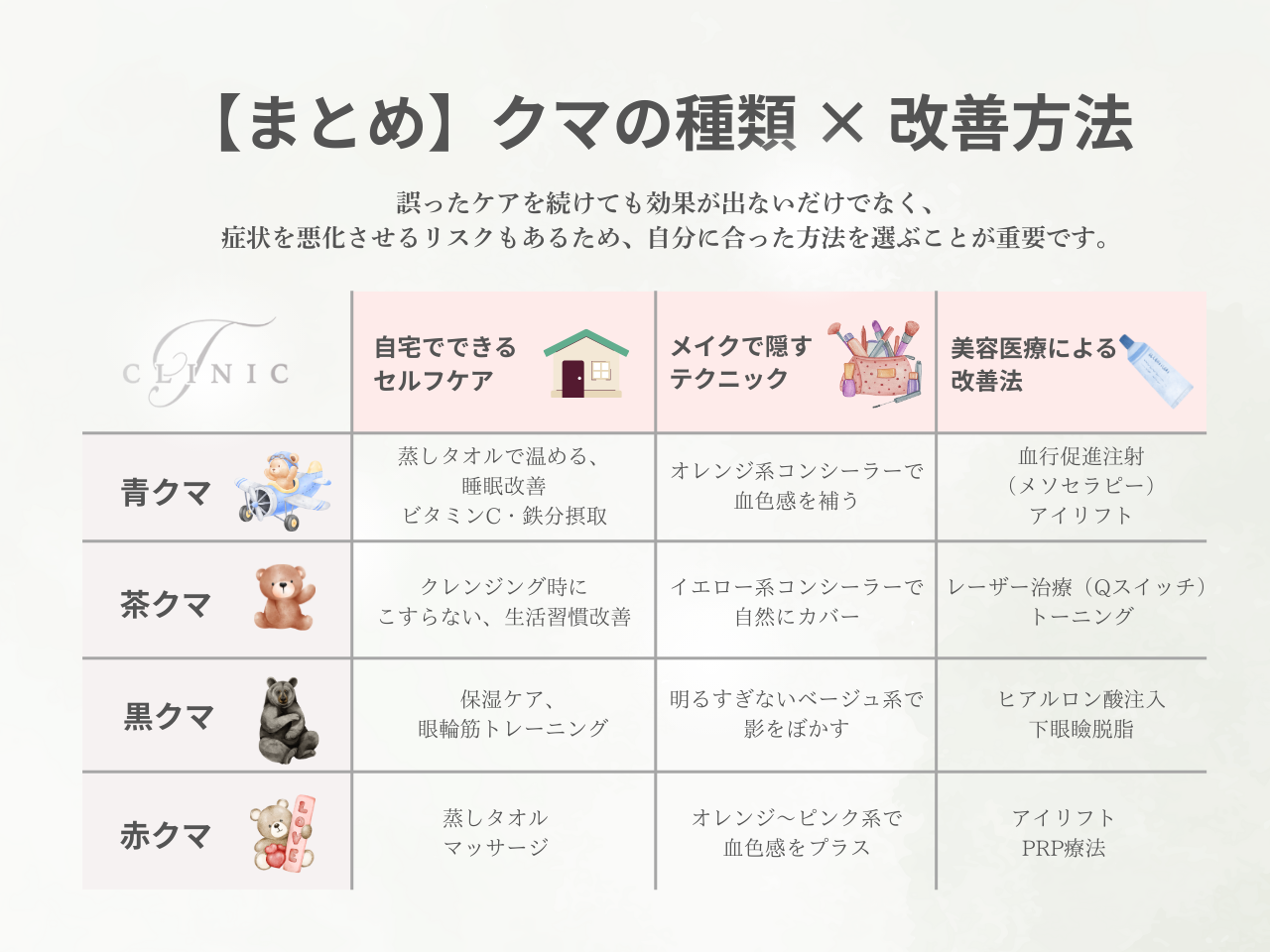 目の下のクマは、種類ごとに原因が異なるため、適切な改善方法もそれぞれ異なります。誤ったケアを続けても効果が出ないだけでなく、症状を悪化させるリスクもあるため、自分に合った方法を選ぶことが重要です。