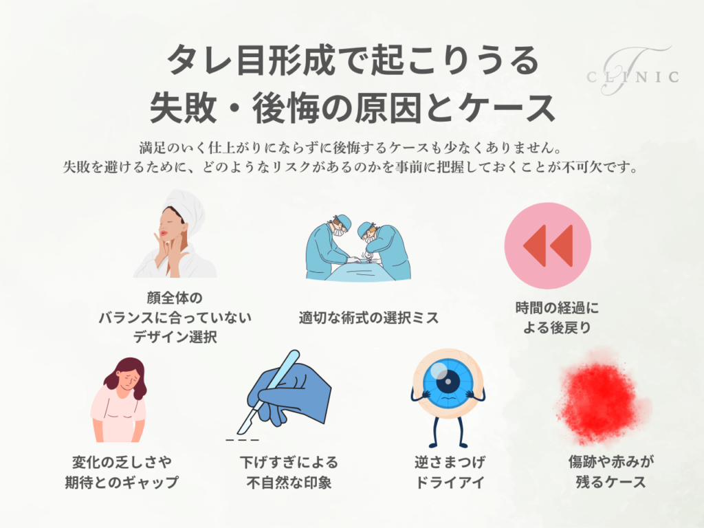 タレ目形成は人気の施術ではありますが、満足のいく仕上がりにならずに後悔するケースも少なくありません。失敗を避けるためには、どのようなリスクがあるのかを事前に把握しておくことが不可欠です。以下に、よくある失敗・後悔の原因を挙げます。