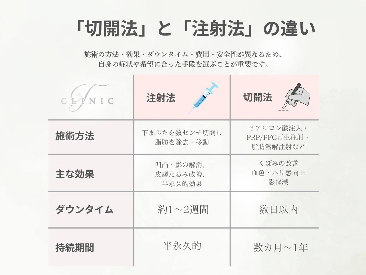 クマ取り治療には、大きく分けて切開法注射法の2種類があります。それぞれ、施術の方法・効果・ダウンタイム・費用・安全性が異なるため、自身の症状や希望に合った手段を選ぶことが重要です。