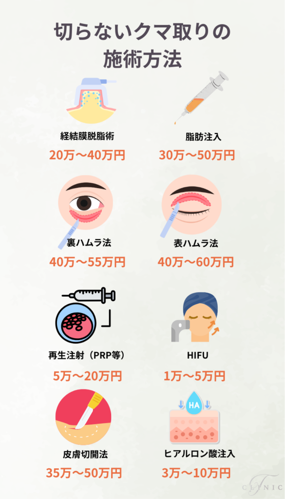 クマ除去には複数の施術法があり、それぞれ価格帯や効果、向いているクマの種類が異なります。