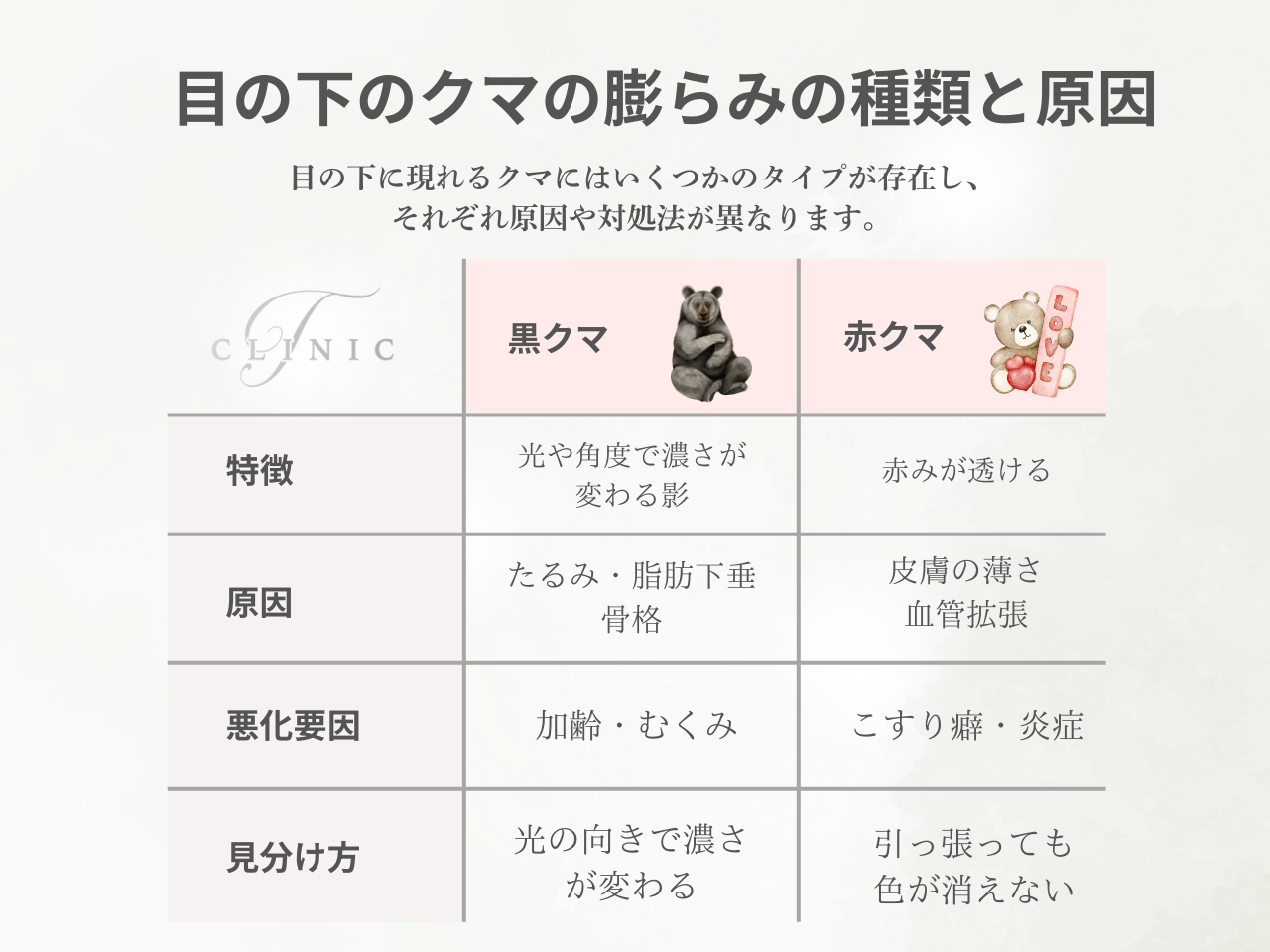 本記事では、目の下に現れるクマの膨らみに悩む方へ向けて、種類・原因・対処法・クリニック選びまで幅広く解説しました。