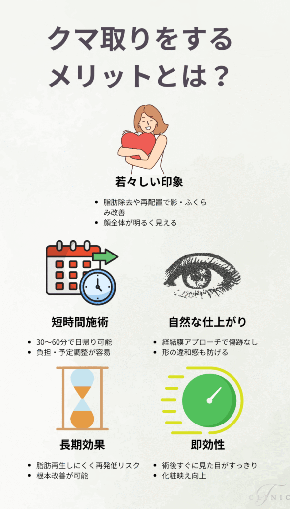 クマ取りは、目元の印象を若返らせるだけでなく、日常生活の自信にも直結する施術です。正しい方法を選び、経験豊富な医師のもとで行えば、美容効果が長期的に持続します。