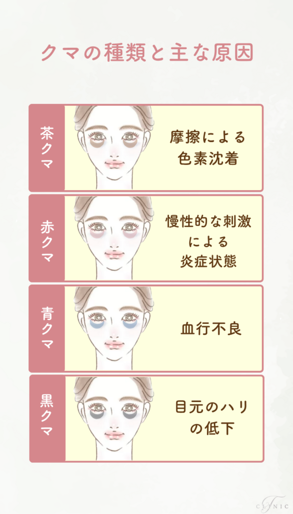 目の下のクマには、茶クマのほかに青クマ・黒クマなど複数のタイプがあります。原因が異なるため、治療法も変わります。例えば青クマは血行不良、黒クマはたるみや影が主な原因です。これらを茶クマと混同すると、施術の効果を感じにくくなる可能性があります。