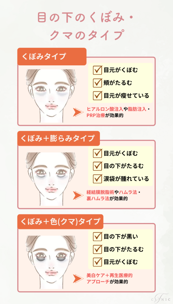 皮下脂肪やコラーゲンの減少で目の下にくぼみができるタイプです。疲れて見える、老けて見えると感じる人の多くがこのタイプに該当します。