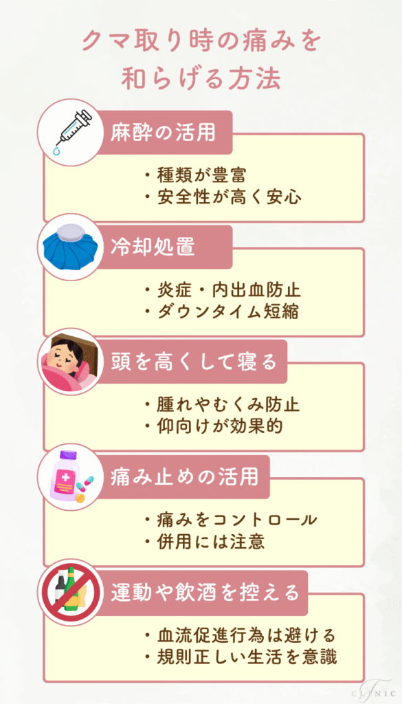 クマ取り後の痛みや腫れを抑えるには、施術直後からの冷却が効果的です。血管を収縮させて炎症を防ぐため、痛みや内出血の拡大を防げます。