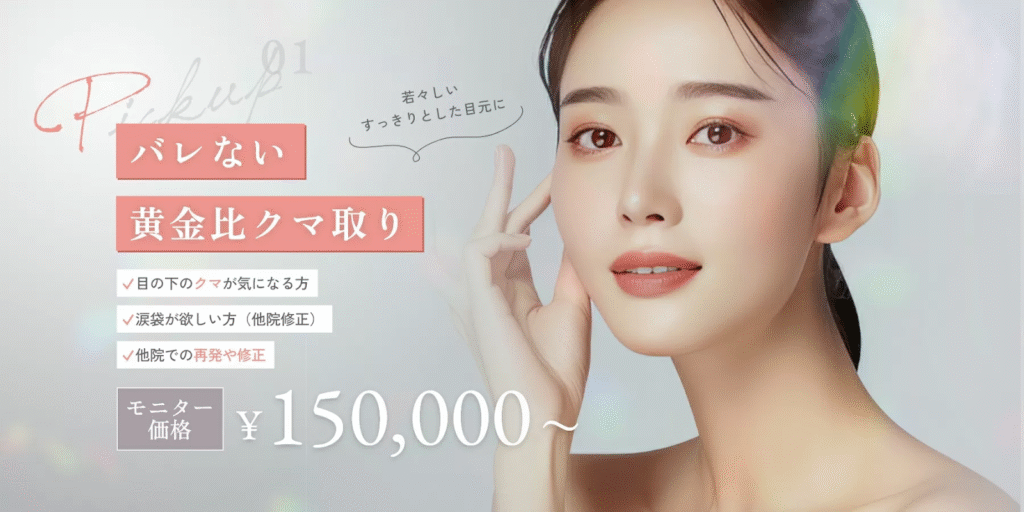 目の下のクマ・ふくらみ・たるみが気になる方は、 Tクリニックの「バレない黄金比クマ取り」がおすすめです。